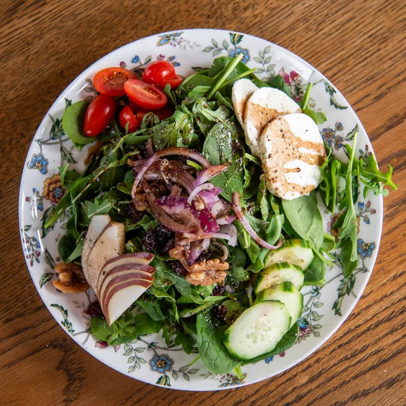 Arugula, spinach, pears, cucumbers, cherry tomatoes, mozzarella, onions, walnuts, cranberries, honey balsamic vinegar