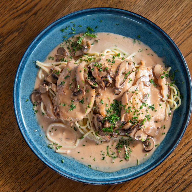 Chicken breast, wild mushrooms, marsala wine sauce, garlic spaghetti.