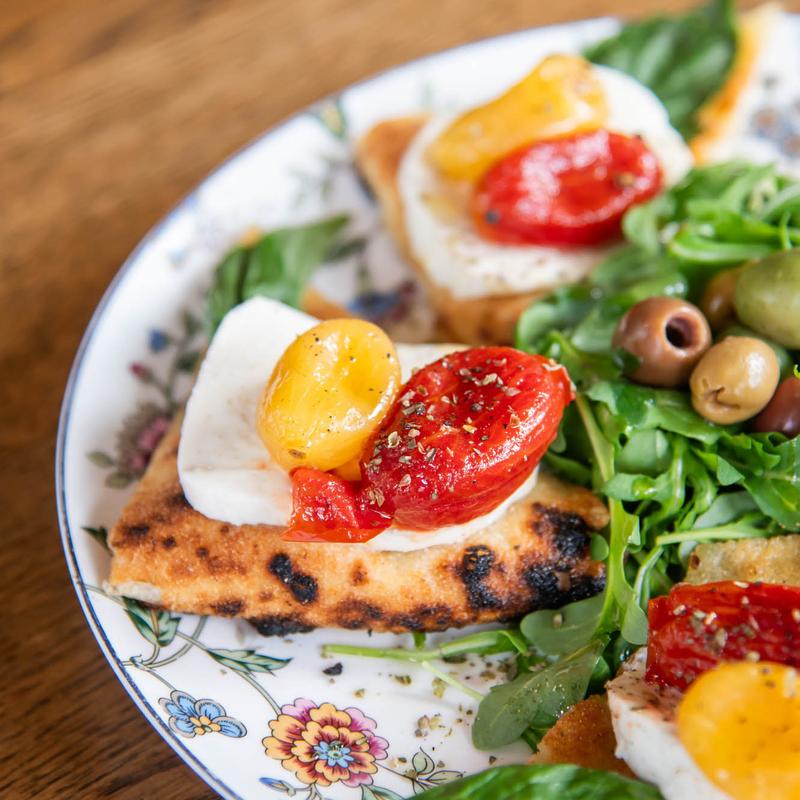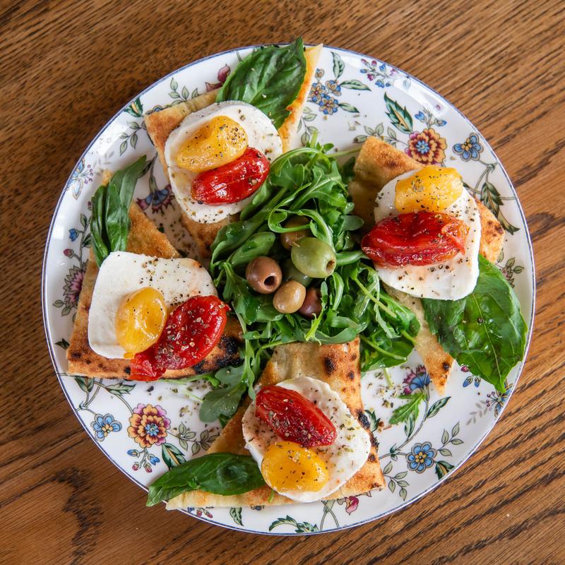 Focaccia, semi-dried tomatoes, buffalo mozzarella.