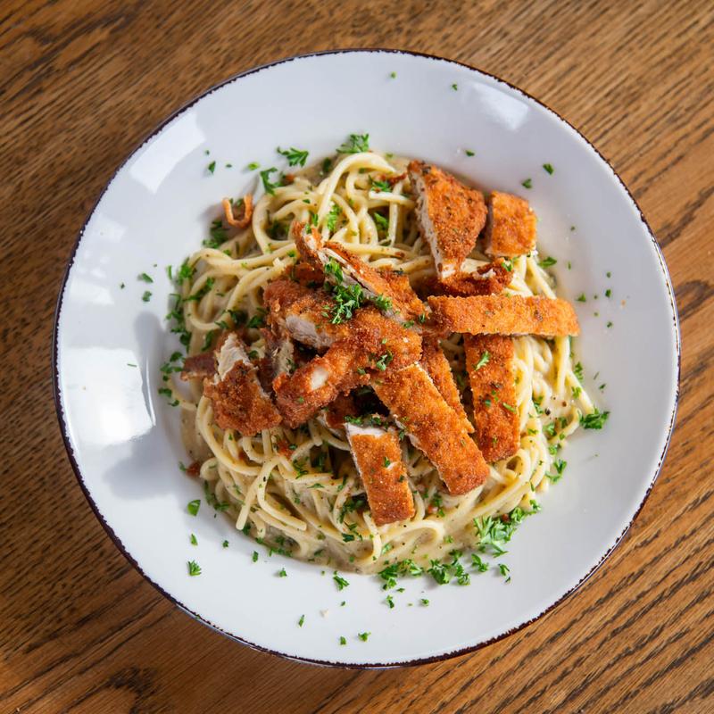 Lightly breaded chicken breast, pecorino, ground black pepper, butter, garlic spaghetti.