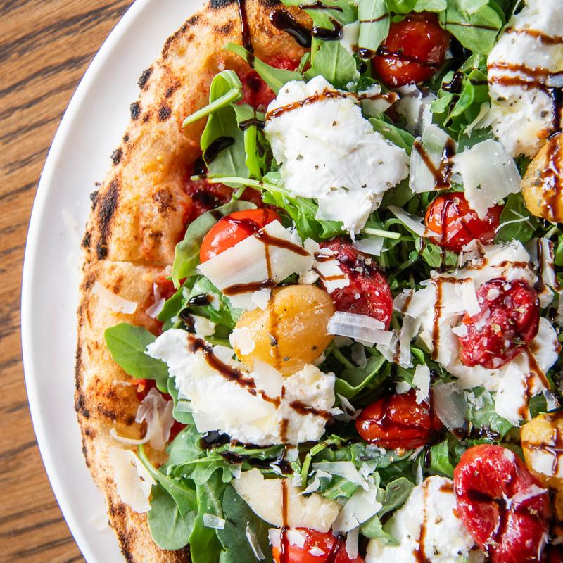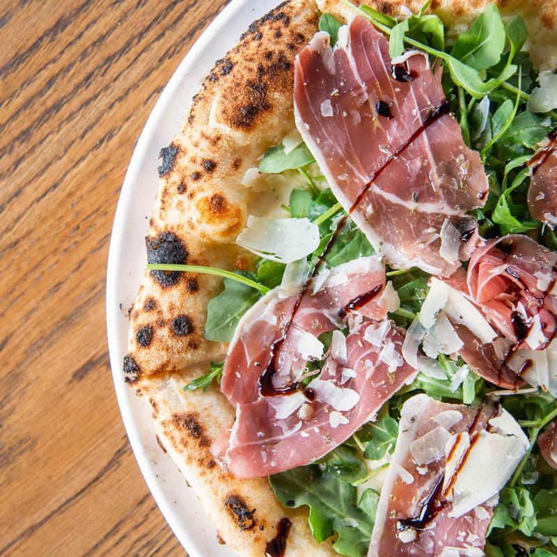 Mozzarella, parmesan, prosciutto di parma, balsamic glaze, arugula, basil.