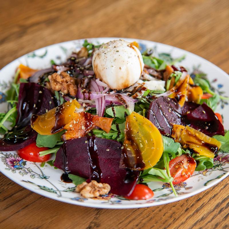 Arugula, roasted beets, tomatoes, burrata, onions, walnut, fig balsamic vinegar, EVOO.
