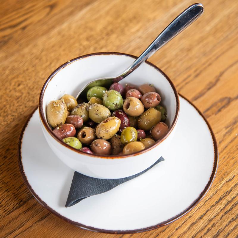 Assorted olives, EVOO.